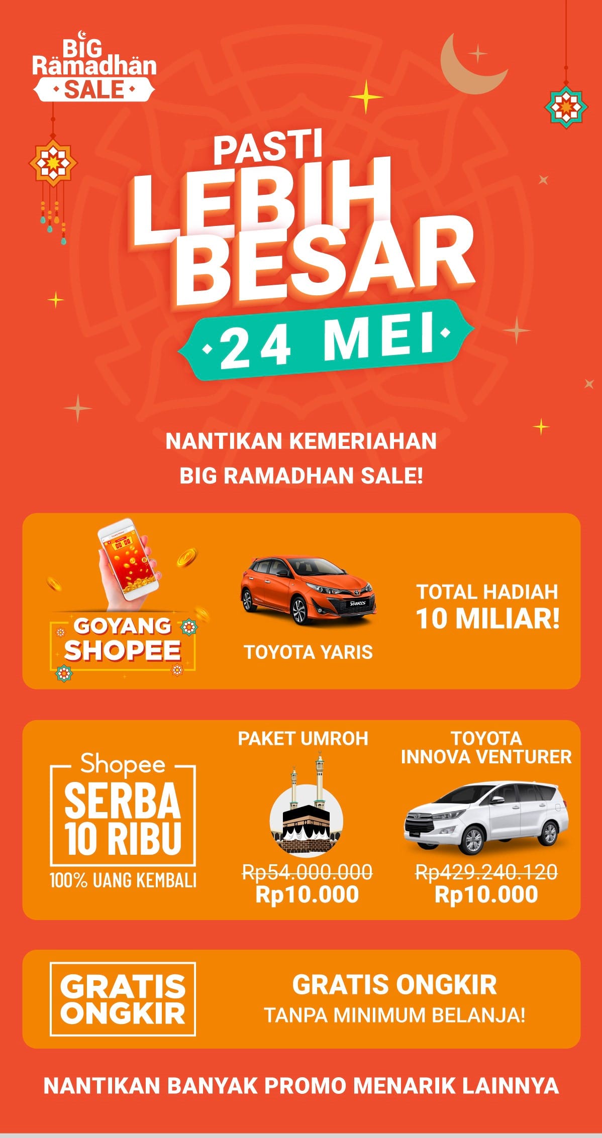 Mumpung sekarang Shopee lagi ngadain Big Ramadhan Sale, setiap harinya ada hadiah seru yang cukup dibayar seharga Rp.10.000,- tidak tanggung-tanggung total hadiahnya sampai 10 miliar loh. Rejeki tidak ada yang tahu, siapa tahu ramadhan tahun ini menjadi ramadhan keberuntungan bisa jadi hadiah terbaik untuk orang-orang baik.