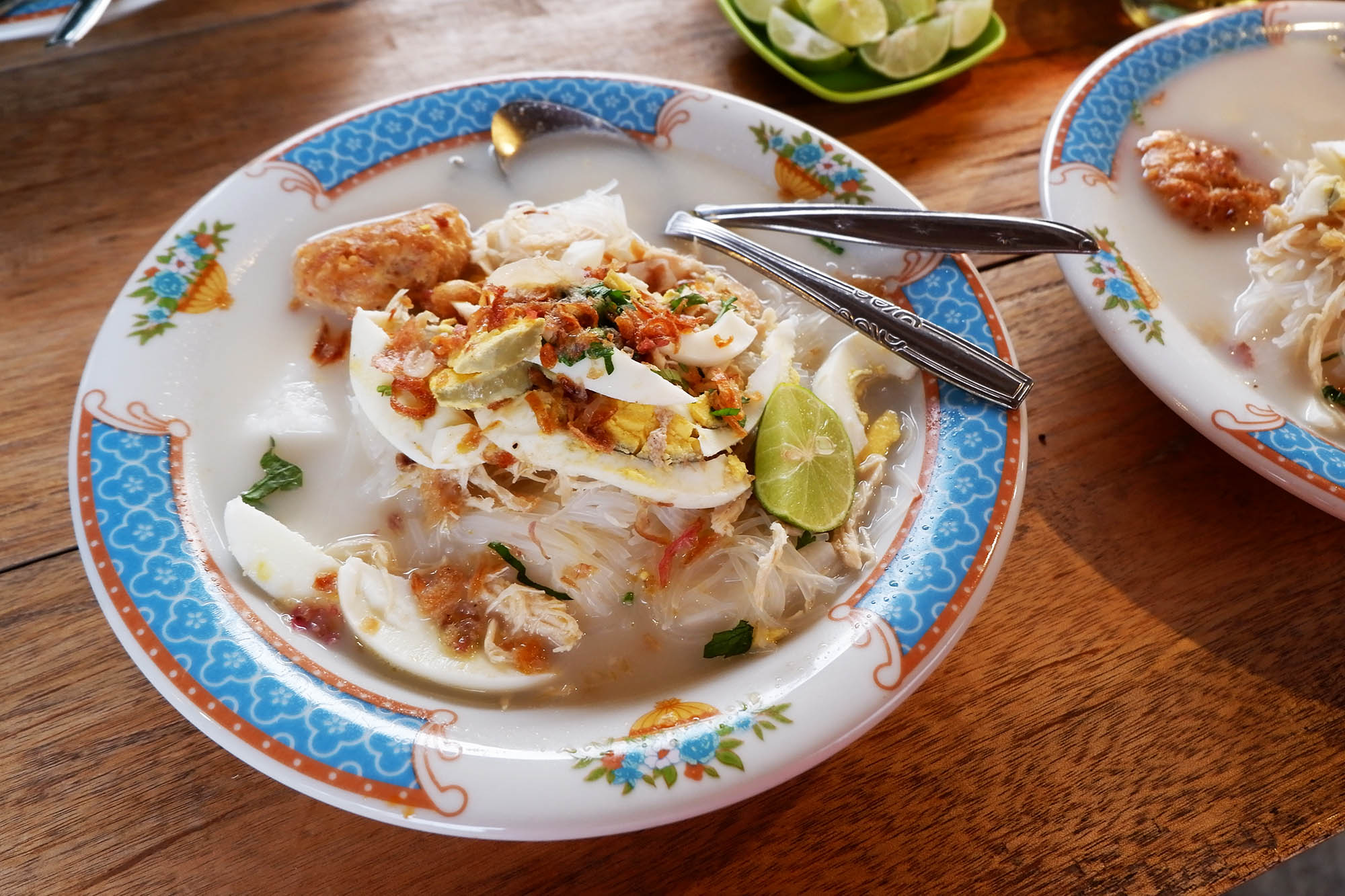Rempah-rempah nantinya diangkat agar tidak ikut masuk ke dalam mangkuk sewaktu dihidangkan. Tambahkan Limau Kuit dan sambal agar lebih nikmat.