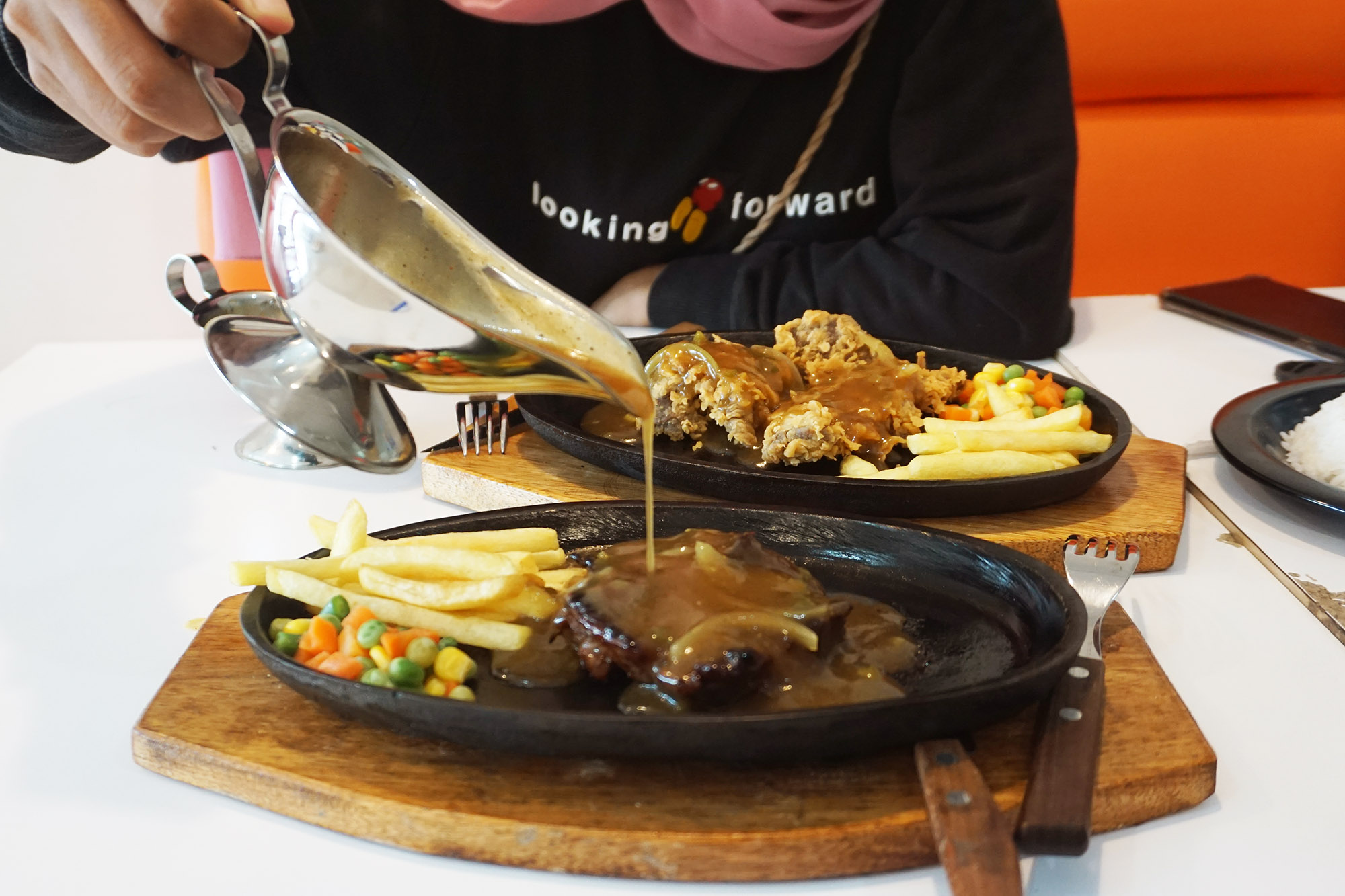 Karena sedang promo, kalian akan mendapatkan free steak beef burger jika memesan salah satu menu untuk seporsi. Tempat yang nyaman tersedia wifi, jadi asyik kan kalau lama-lamaan di sini hehe. Tidak perlu menunggu lama, beberapa menu yang saya pesan diantar ke meja dengan hot pan yang panas lengkap dengan kentang goreng, potongan wortel, jagung dan kacang polong.
