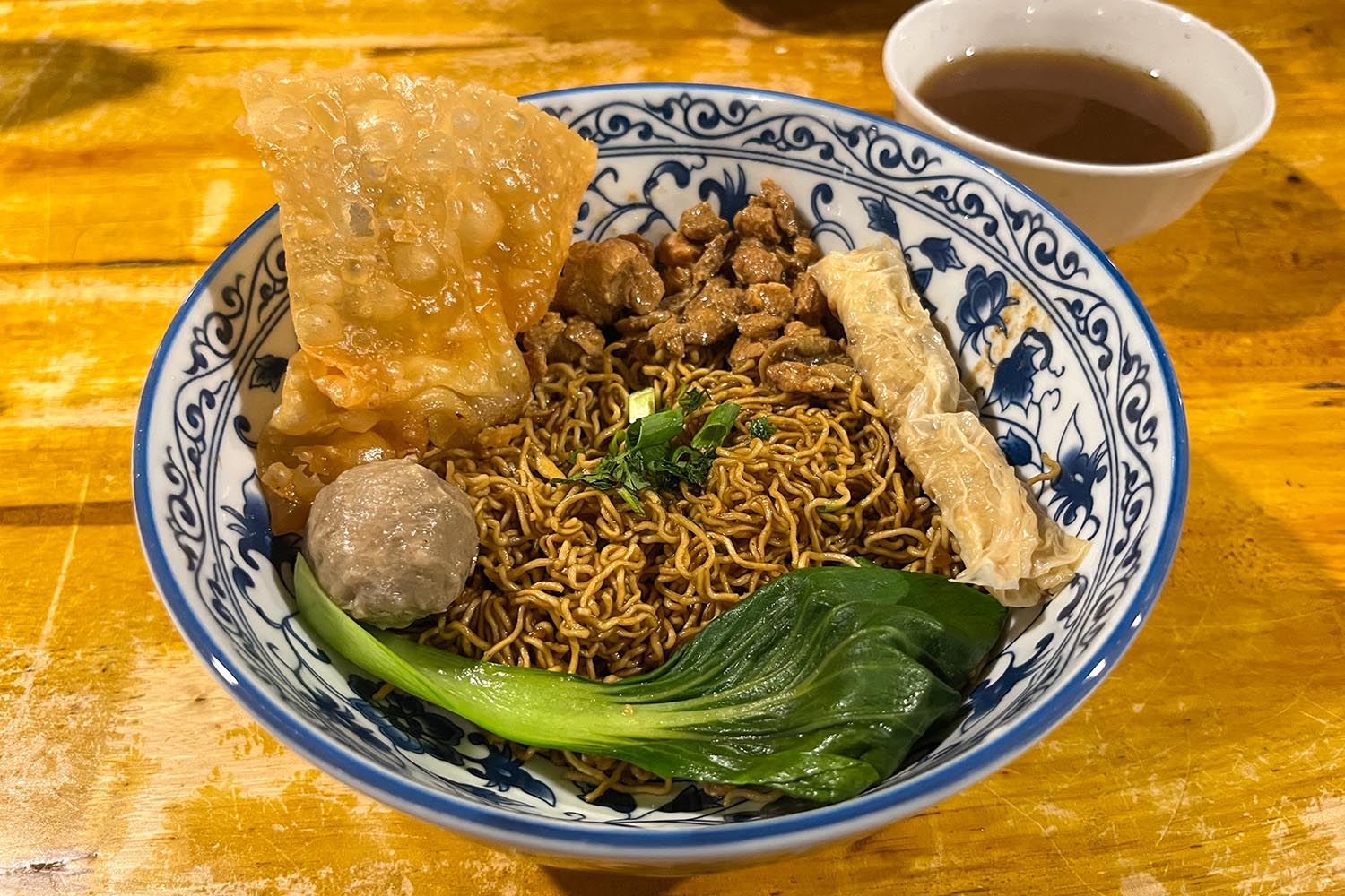 Yamin manis komplit disajikan dengan potongan ayam jamur, pangsit goreng, bakso, sayur, dan seharusnya ada telur tapi karena sedang habis telurnya diganti hekeng udang. Rasa mienya nggak kelewat manis, takaran kecapnya cucok banget.