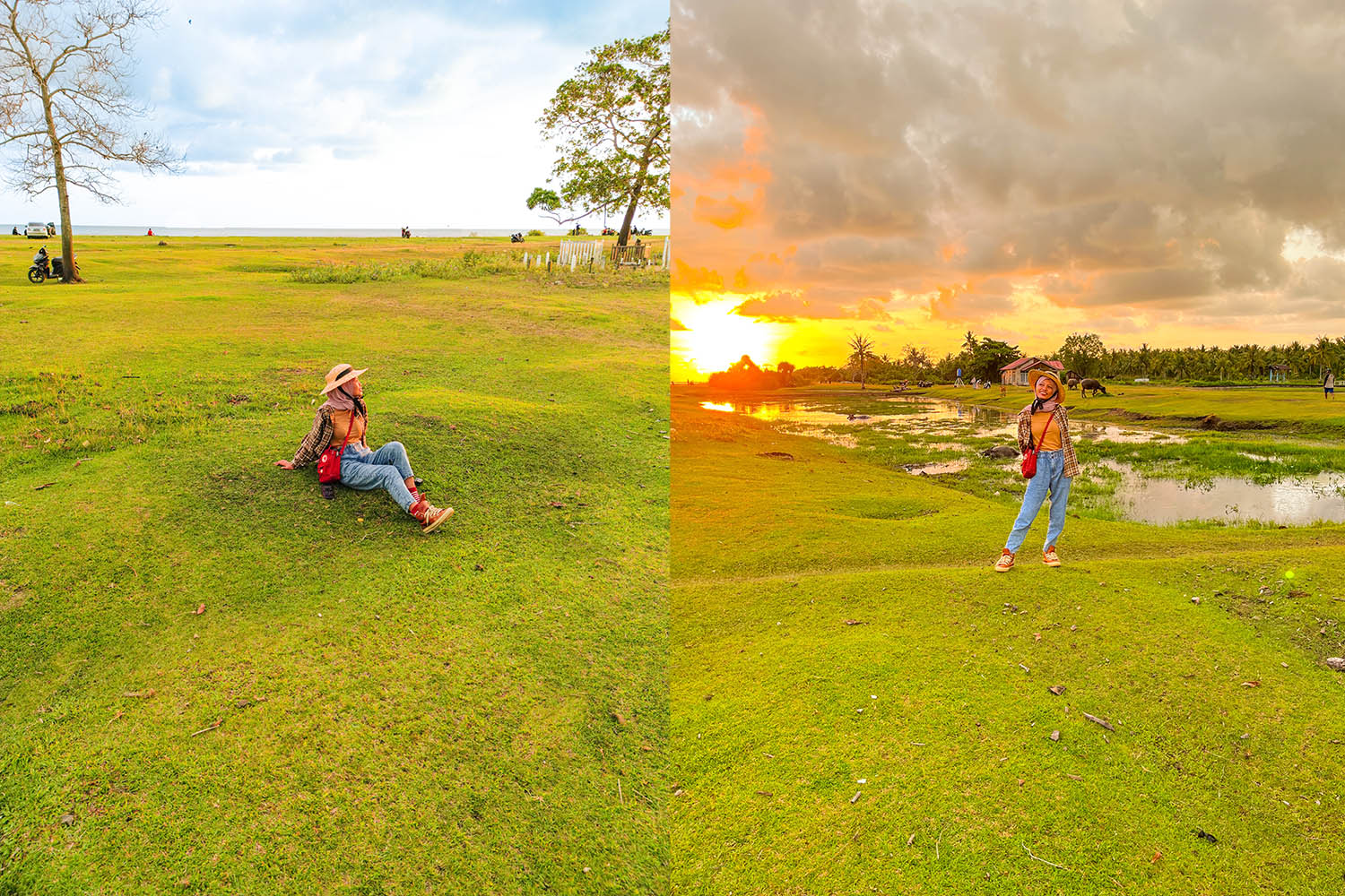 Dengan mengikuti jalan utama ke arah matahari terbenam, benar saja kami menemukan sebuah pantai unik dengan rerumputan luas (kalau diperhatikan kok mirip di Sumba yaa 🤔). Coba deh intip video reels saya di bawah ini: