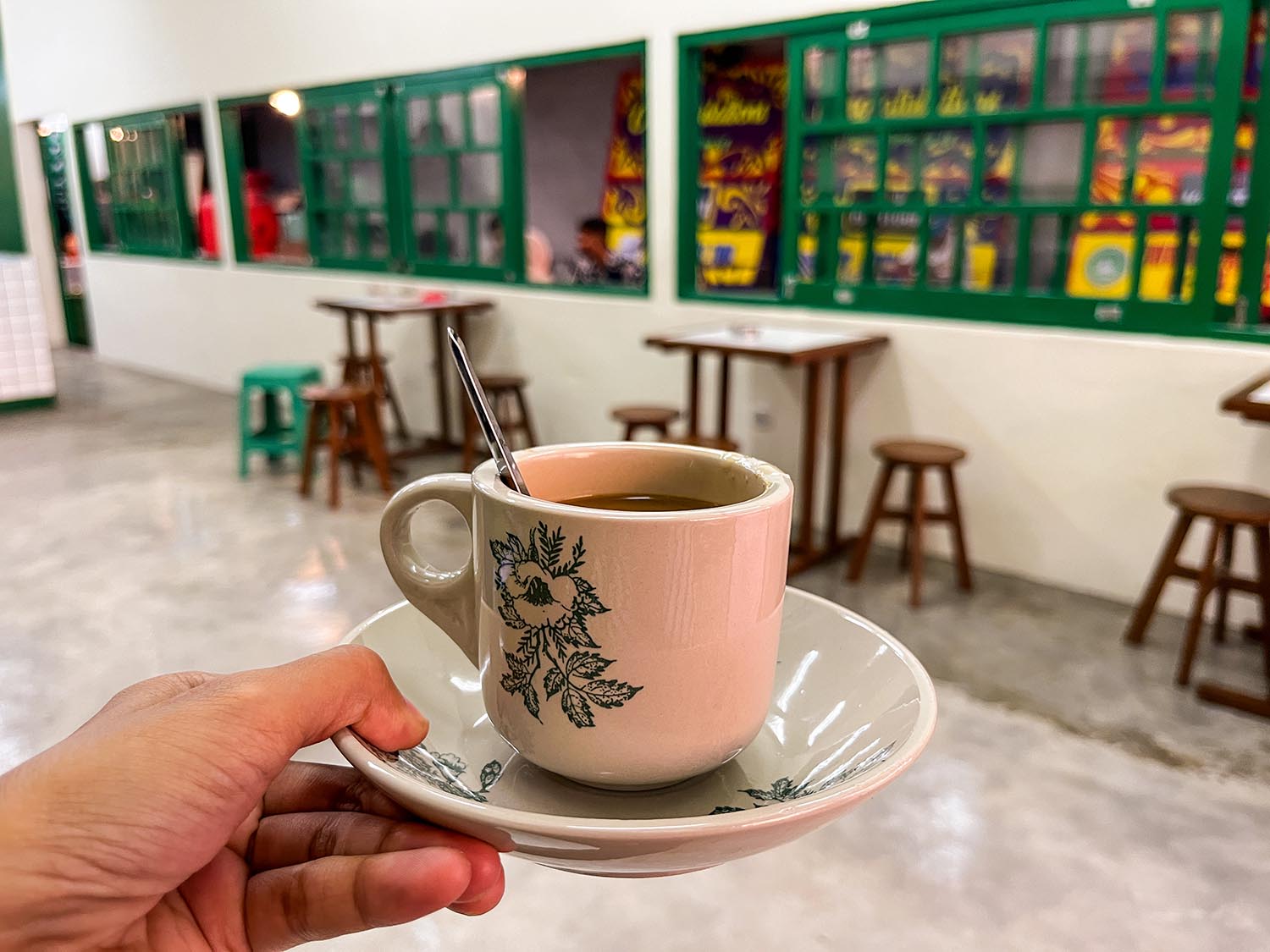 Namanya Lao Kopitiam, berada di sebuah ruko dua tingkat terlihat cukup ramai pengunjung yang sedang duduk ngopi mulai dari indoor, maupun outdoor. Kedai kopi ini cukup terbilang masih baru, bernuansa asian jadul dengan warna hijau yang dominan di setiap sudutnya.