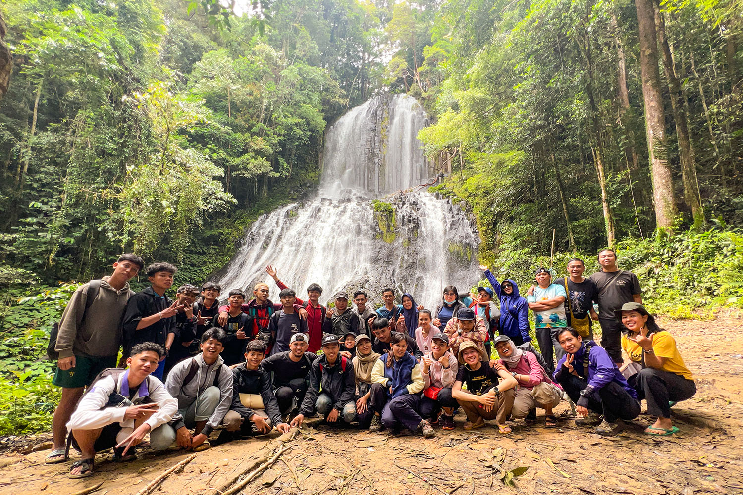 Air Terjun tinggi yang tediri dari beberapa tingkat sebagian tebing, mengalir air cukup deras bak tirai raksasa. Sekitarnya banyak pepohonan menjulang tinggi, jadi kita bisa membentang hammock untuk berswa foto. Menurutku dari berbagai sudut riam ini benar-benar mempesona, semakin dekat dengan aliran air semakin cakep, asalkan perangkat kamera/handphone kita cukup tahan air ya.