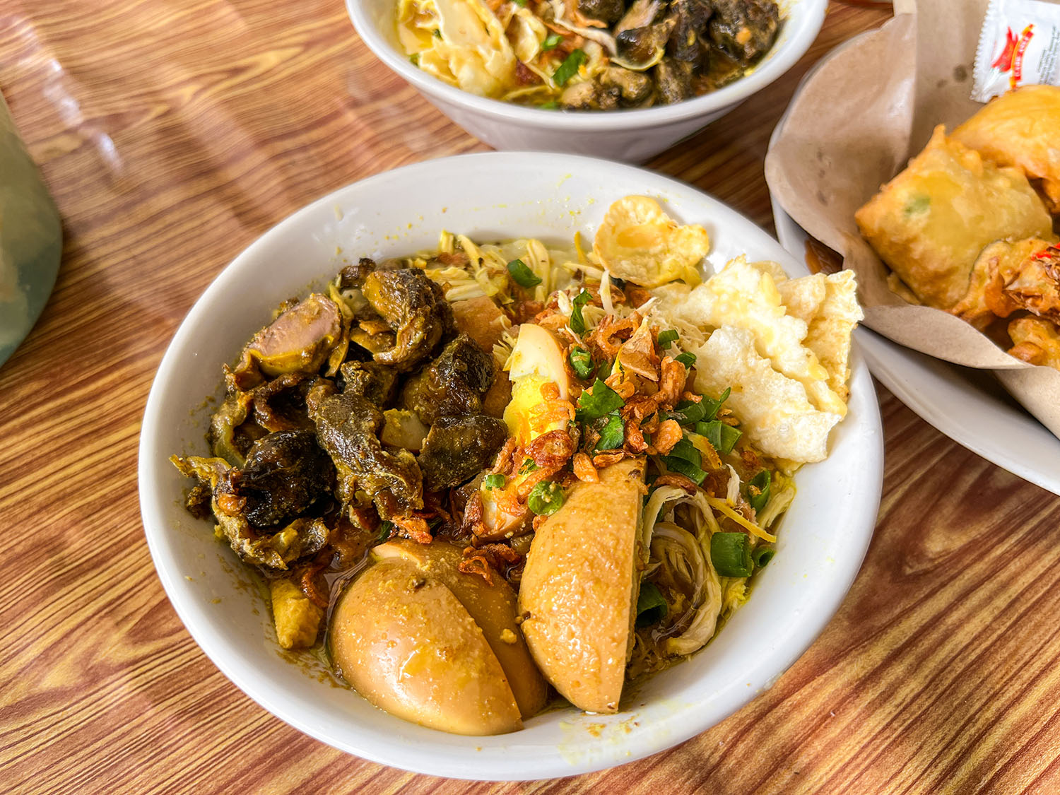 Porsi standar saja toppingnya sudah sepenuh ini, sampai buburnya gak kelihatan, apalagi porsi komplit yahh hehehe. Menariknya di sini tambahan kacang sengaja sudah diletakkan di meja masing-masing, jadi bisa tambahkan sendiri sesuai selera atau tidak sama sekali, gratis! Terus tersedia juga aneka gorengan seperti martabak mini dan bala-bala, lengkap dengan saus kacang dan sambalnya, harganya ini Rp.2.000,-/item.