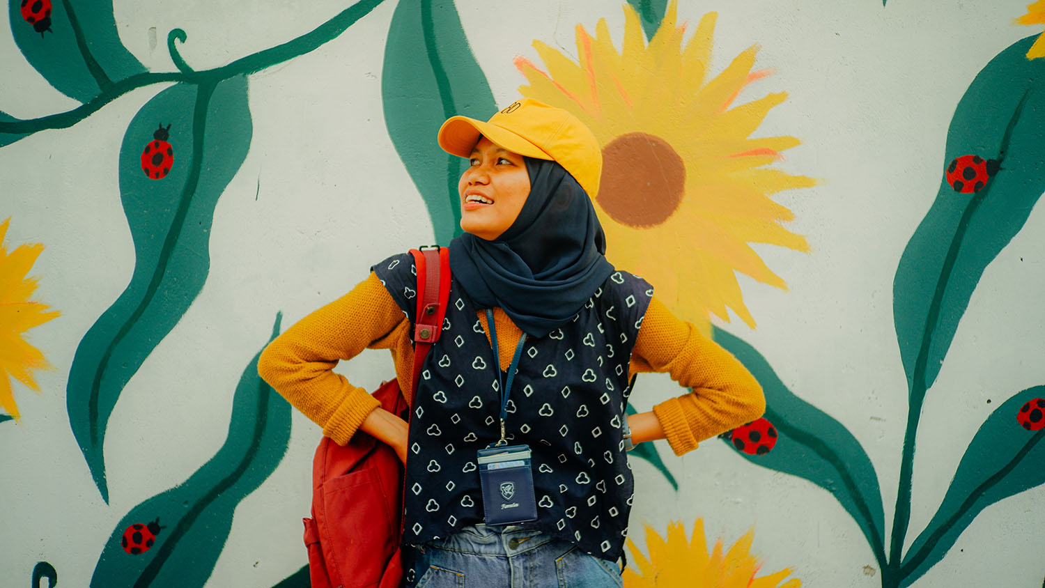 Karena vibes-nya mirip dengan outfit yang aku pakai hari ini jadi aku banyak foto-foto di mural bunga matahari ini, foto-foto cantik diabadikan dengan baik oleh temanku Rari 🌻