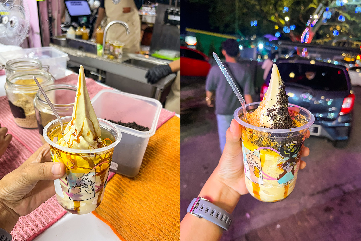 Pesananku tertuju ke Ice Cream Series “Gula Apong Ice Cream Large” seharga RM9.90 dan sudah free 2 toppings. Kebetulan pesanan ibu-ibu yang nitip sama juga, hanya nanti milih toppingnya yang berbeda, hehe. Kurang lebih 8 cup yang aku pesan, setelah proses bayar kita pindah ke bagian meja take away sekalian pemilihan topping-nya, disini juga bisa kita lihat proses penyajiannya.