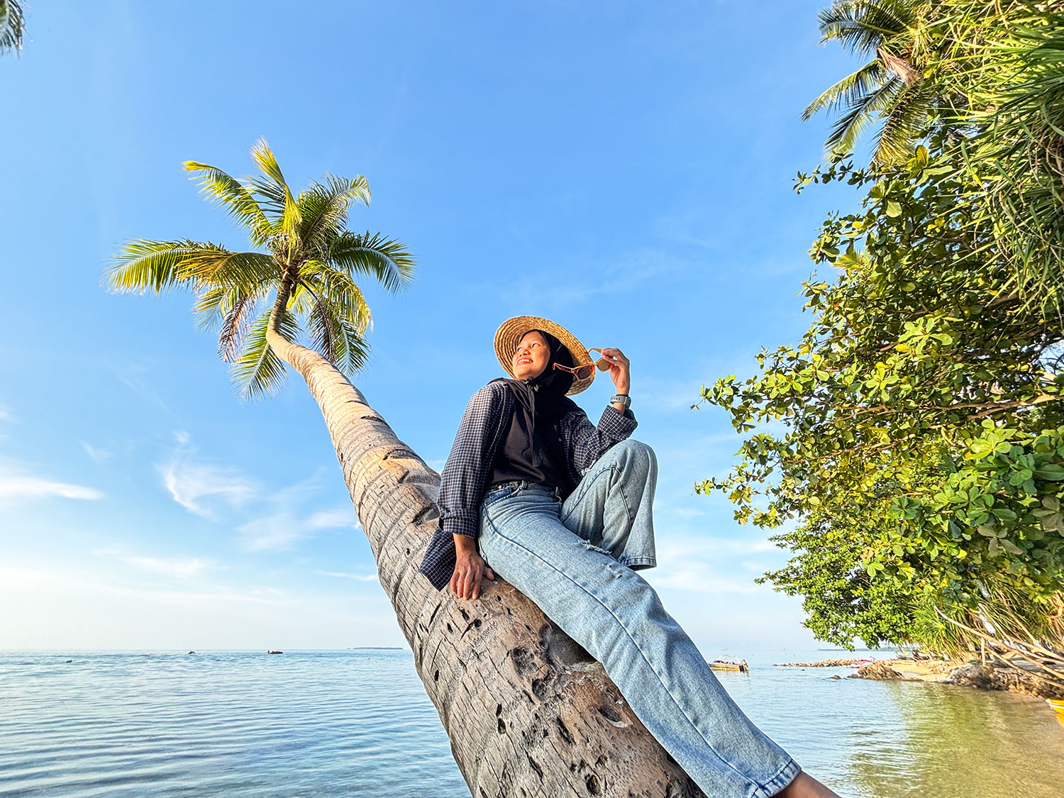 Pantai Ujung Gelam punya spot foto yang tak boleh dilewatkan, bahkan untuk berfoto di sini harus antri, yaitu sebuah pohon kelapa yang miring ke laut. Untungnya kedatangan ku ini bukan saat musim liburan yaaa, jadi hanya ada sekitar 2 atau 3 orang saja yang mengantri. Kabarnya kalau musim liburan bisa sampai 30an orang yang mengantri.