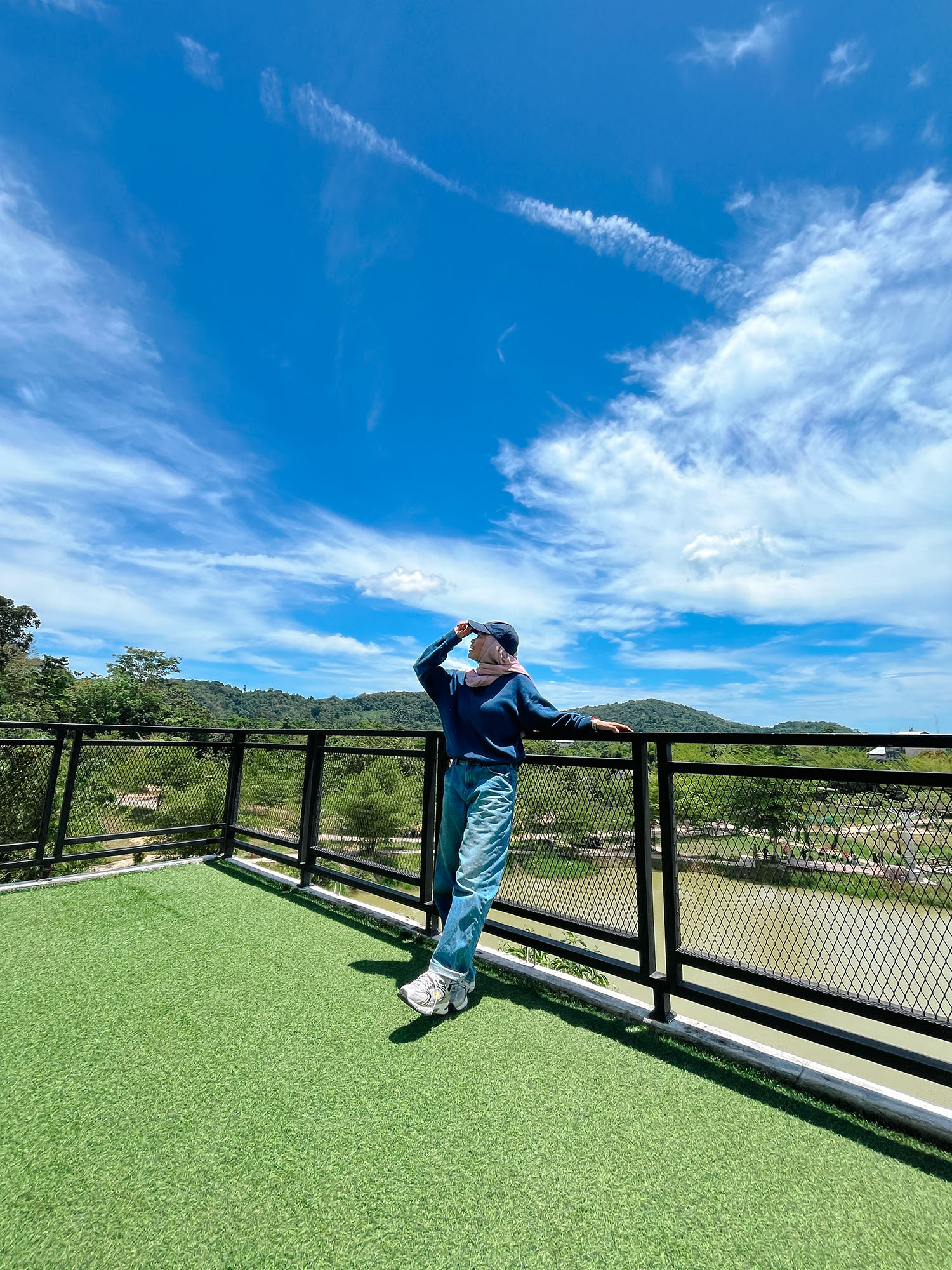Area resto ini juga terdapat sebuah rooftop teras yang sepertinya jadi spot favorit pengunjung untuk berswa-foto, bisa jadi karena pemandangannya yang bagus, banyak pepohonan, danau hijau, dan terlihat dari atas beberapa aktivitas wahana lainnya seperti flying fox, sepeda gantung dari atas sini. Meskipun ini benar-benar panas, tapi orang yang ingin berfoto di sini cukup antri juga. Lantas, aku pun tak mau ketinggalaman untuk foto dan ambil beberapa video di sini. Hasilnya? Liat saja di bawah ini!